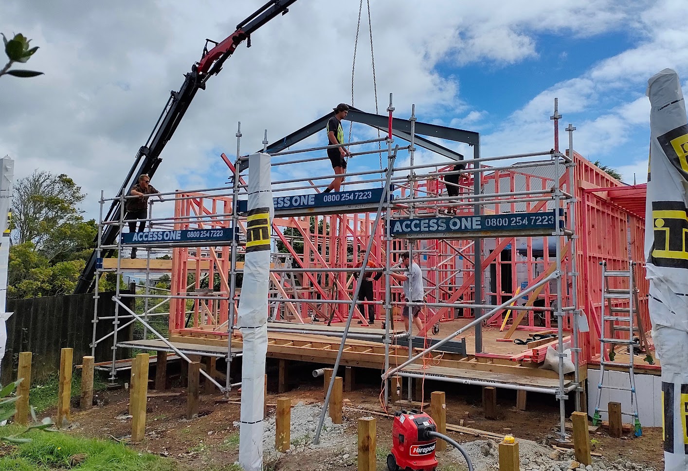 The remaining orginal part of the house was first re-leveled, before the new extension was built. The new structure used a large steel portal to allow for high ceilings and an open plan kitchen and lounge area. Great attention to detail was required to create a seamless connection between old and new parts of the house.